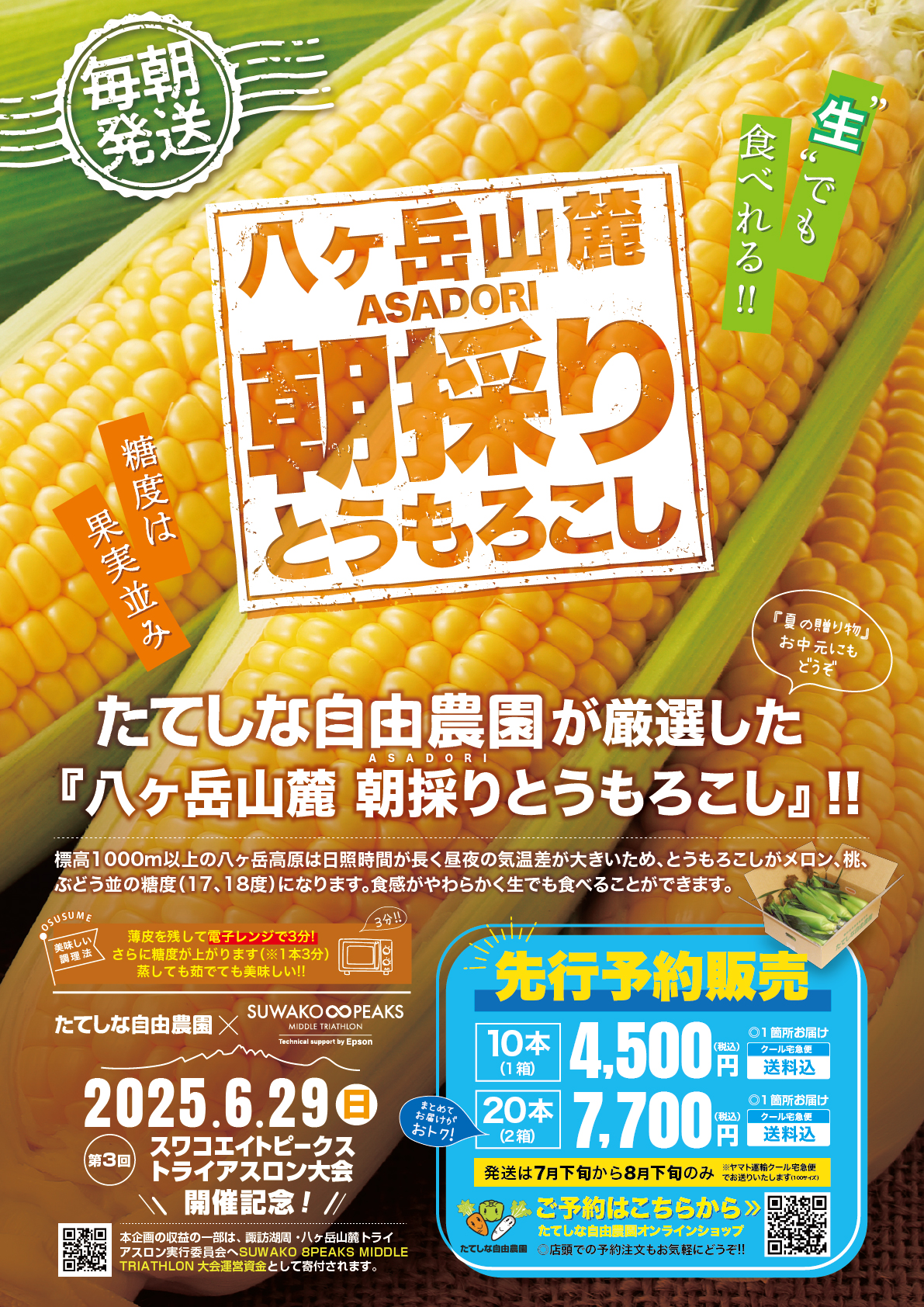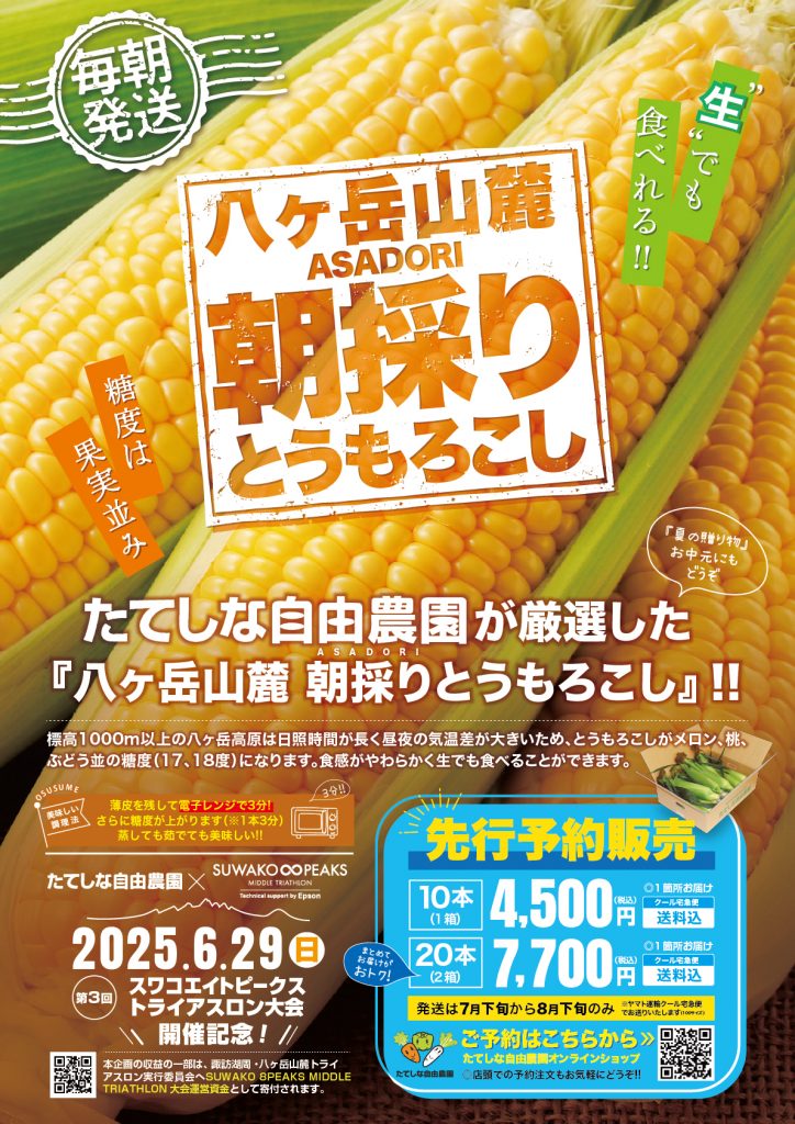 美味しい農産物を知り尽くしたたてしな自由農園が、大会記念に厳選して発売する『八ヶ岳山麓 朝採りとうもろこし』は果実並の糖度を持つ、やわらかい触感の生でも食べられる新鮮とうもろこし。